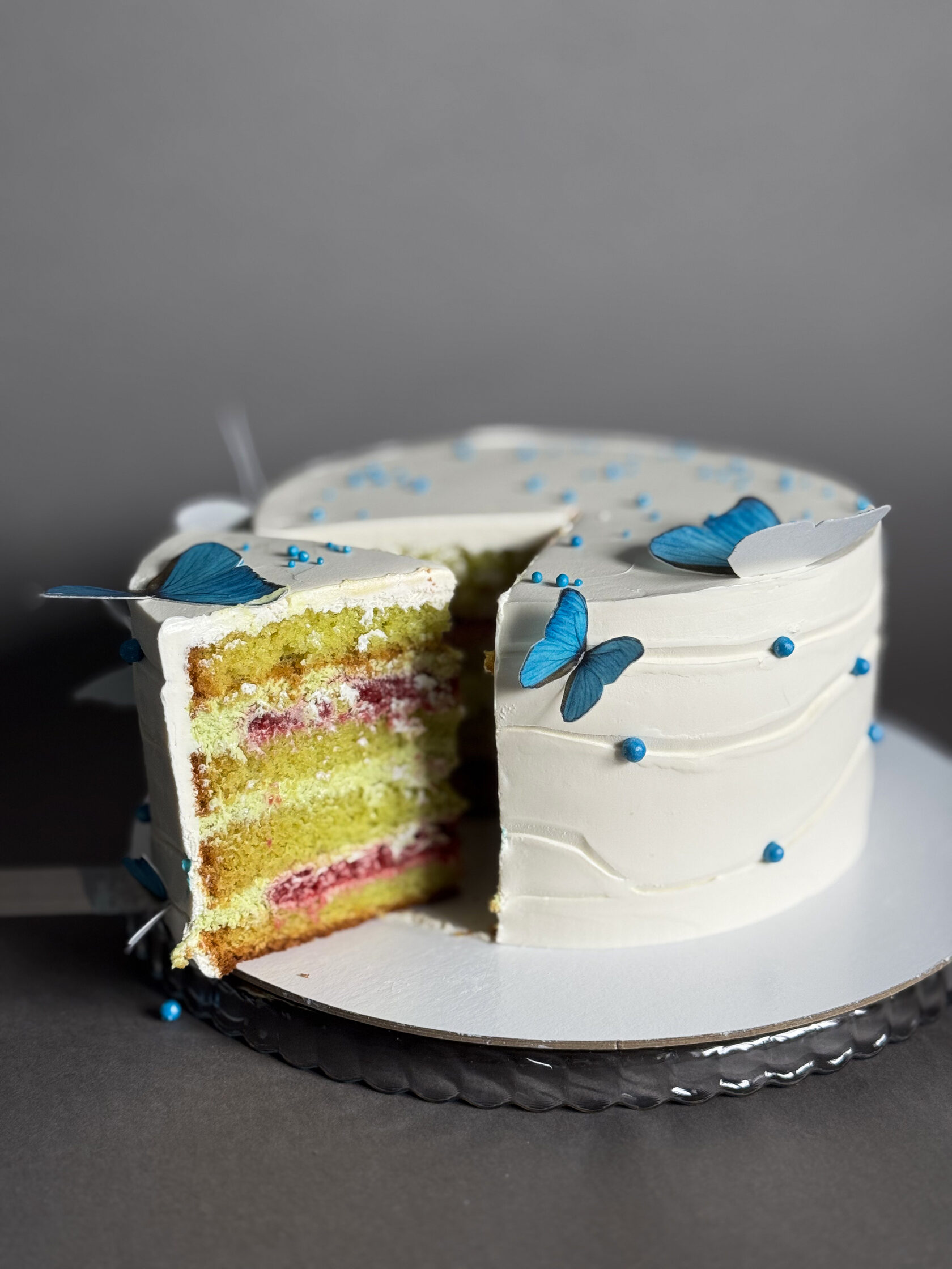 - Воздушная прослойка сливочно-фисташкового крема на основе крем-чиза и фисташковой пасты;